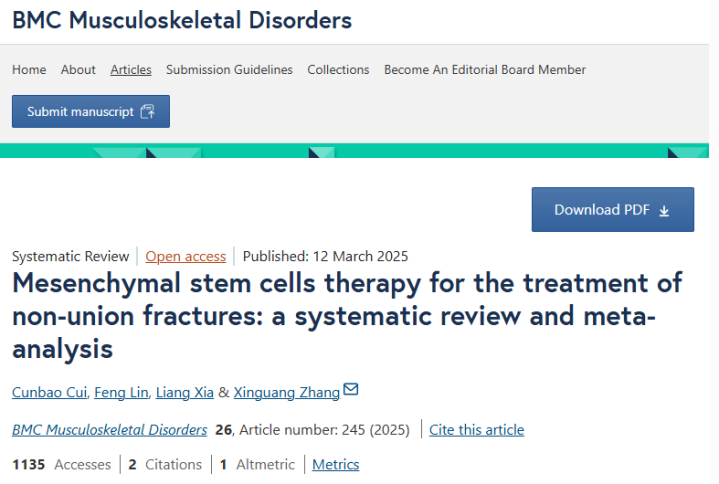 近期,国内研究人员在国际期刊《BMC Musculoskeletal Disorders》上发表了一项系统综述与荟萃分析,综合评估了21项临床研究(包含8项随机对照试验和13项队列研究,共计866例患者)的数据,全面评估了间充质干细胞治疗骨折不愈合的有效性与安全性。
